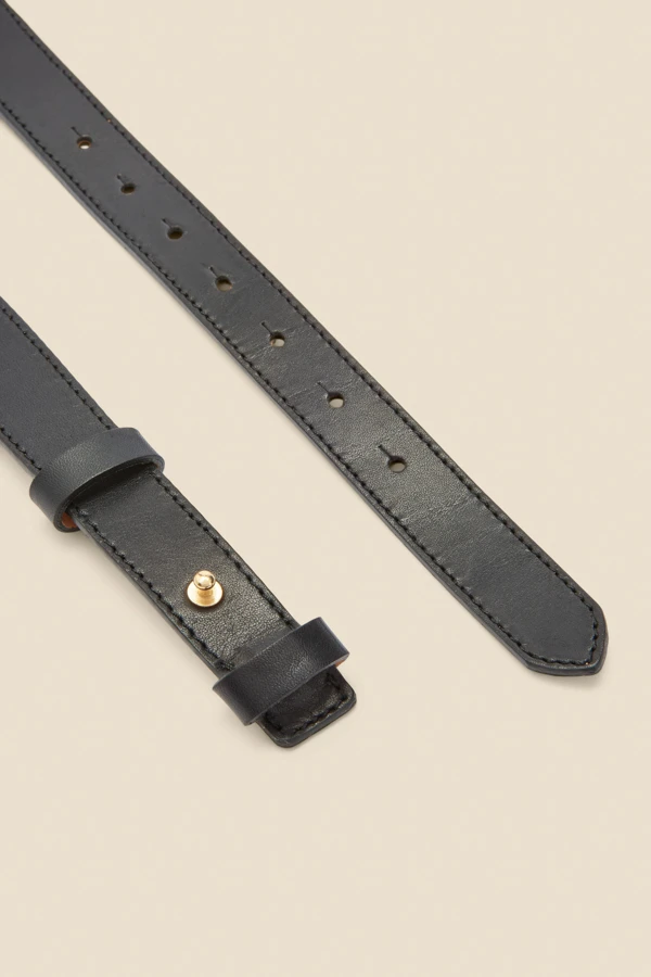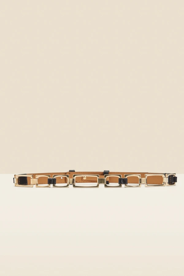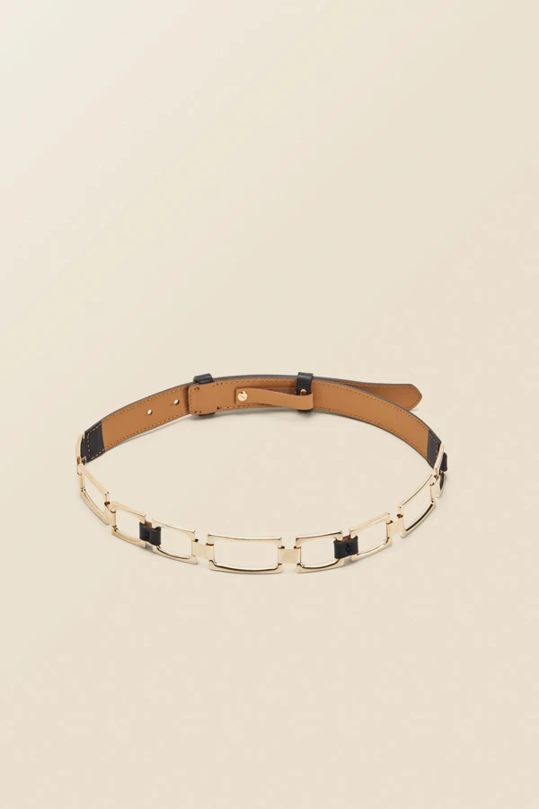 Black Leather Waist Belt With Chain Trim