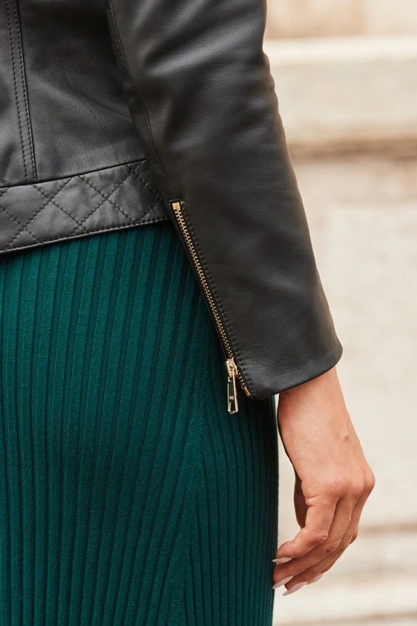 Black Quilted Round Neck Leather Jacket With Gold Buttons