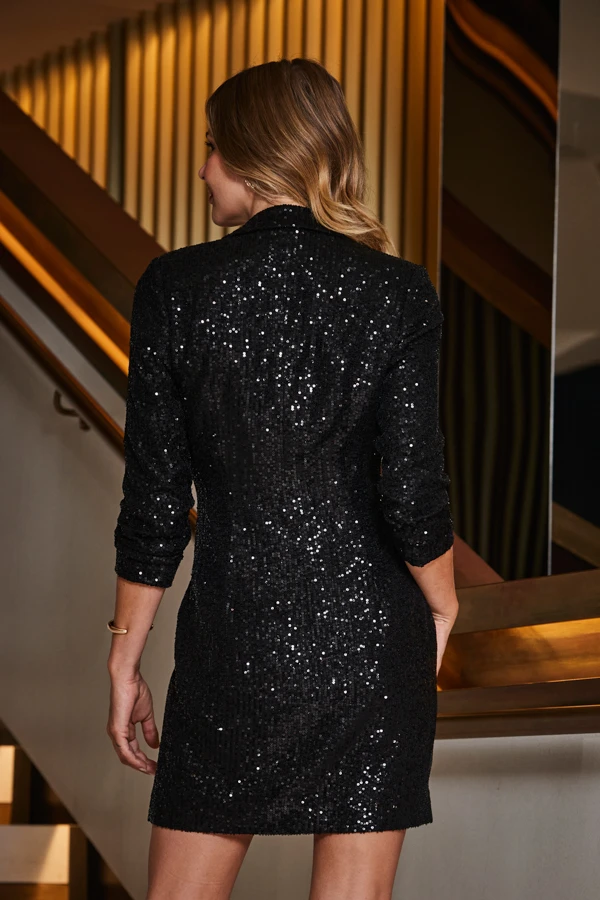 Black Sequin Ruched Sleeve Blazer Dress -Opal & Oak Store web crop 2309 29 a23dw053bk0001 29 178