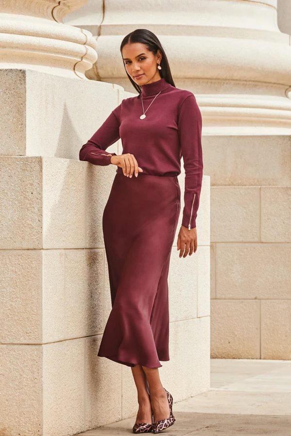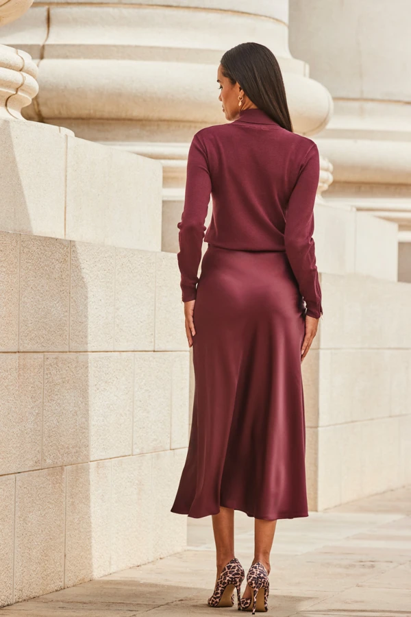 Burgundy Satin Midi Skirt