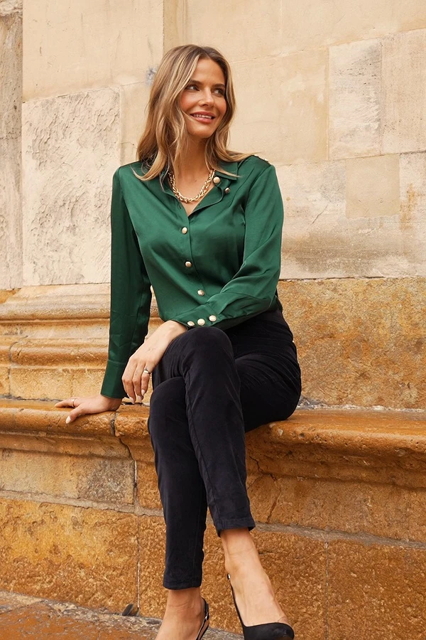 Emerald Green Luxe Satin Shirt With Gold Button Detail