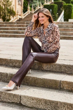 Chocolate Brown Faux Leather Button Front Kick Flare Trousers