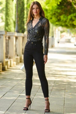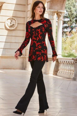 Black & Red Baroque Print Keyhole Detail Fluted Cuff Jersey Top