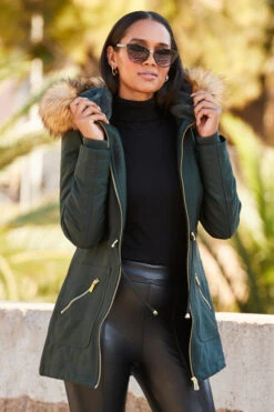 Green Faux Fur Hooded Parka With Gold Zip Pockets